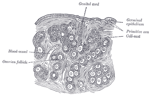 مقطع عرضي لمبيض فتاة حديثة الولادة موضحا تركيبة المبيض