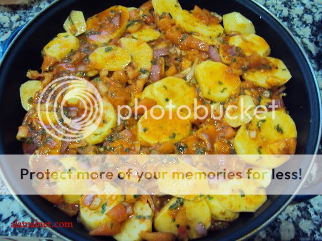 نخلط البطاطس مع ما تبقى من التتبيلة والطماطم والبصل ثم نضع الكل في صنية